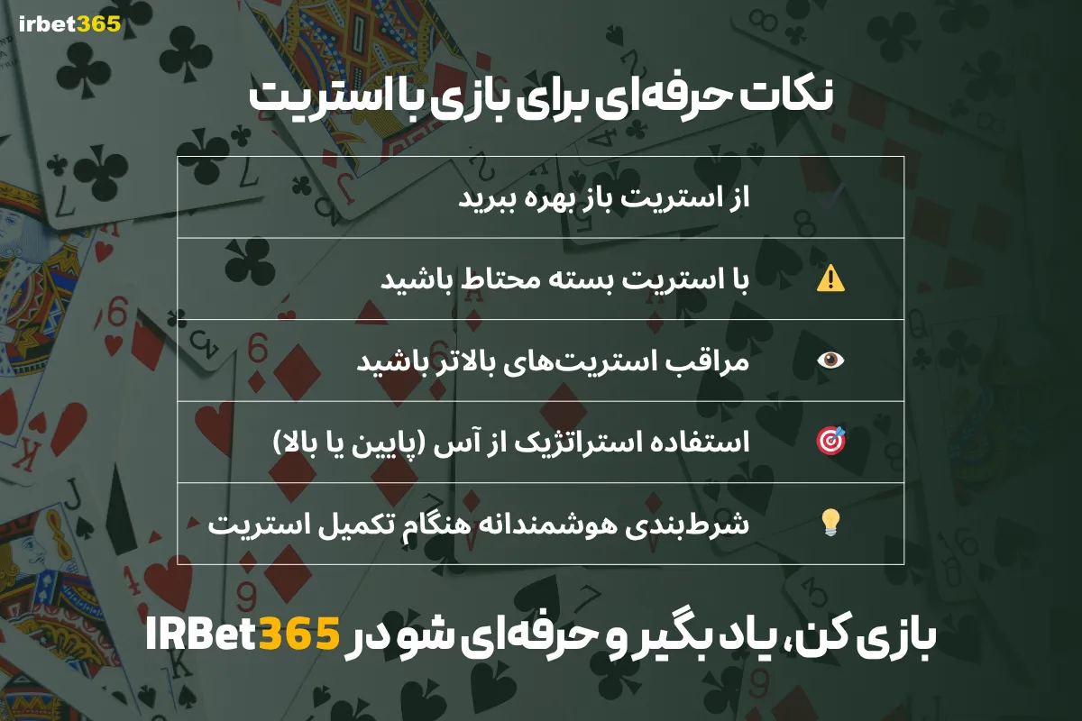 اگر احتمال میدهید حریفان شما دستهای قویتری دارند (مثل فول هاوس یا فلاش)، وقتی که فقط استریت دارید، احتیاط کنید و از شرطهای سنگین خودداری کنید.